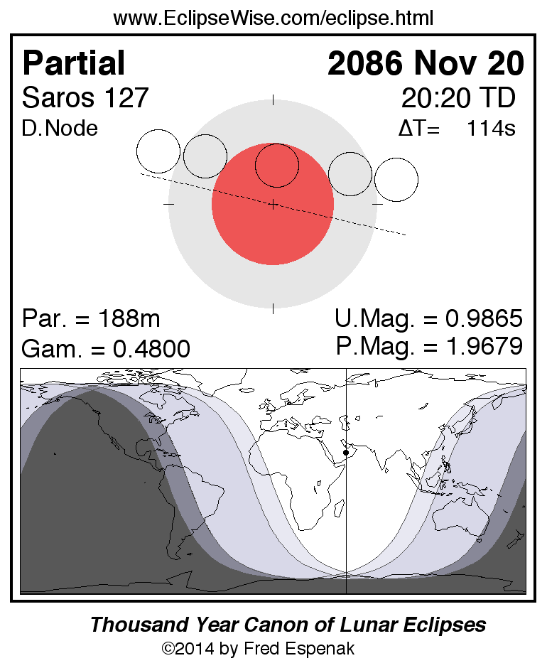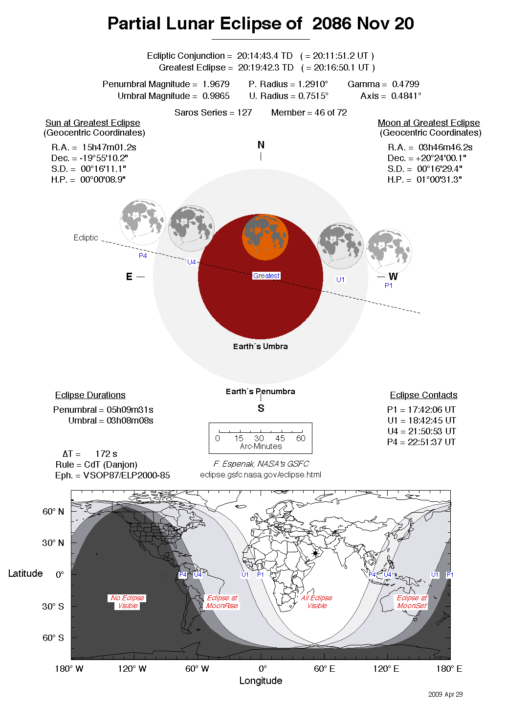 The tables below contain detailed predictions and additional information on the Partial Lunar Eclipse of 2086 Nov 20 .