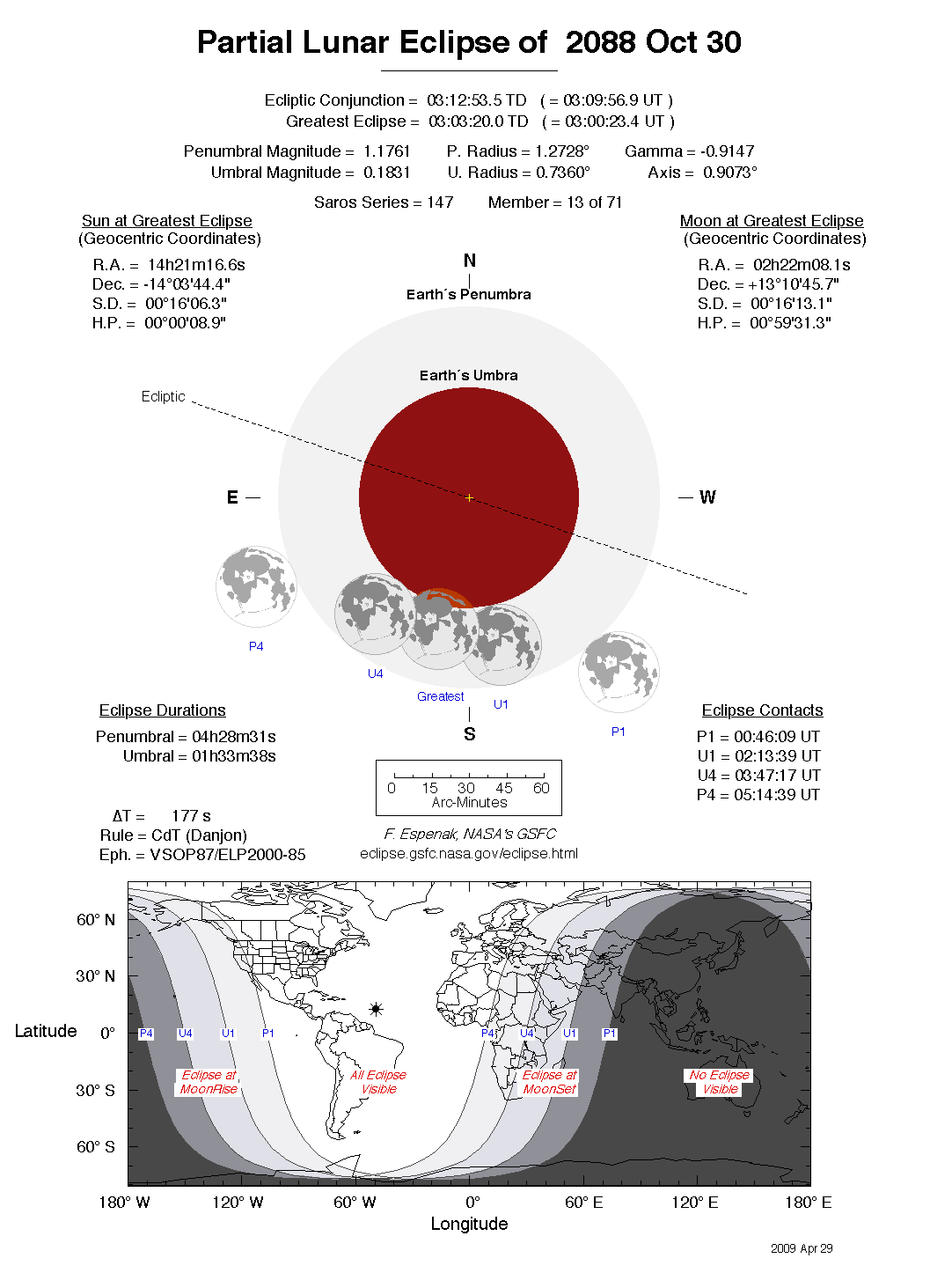 The tables below contain detailed predictions and additional information on the Partial Lunar Eclipse of 2088 Oct 30 .