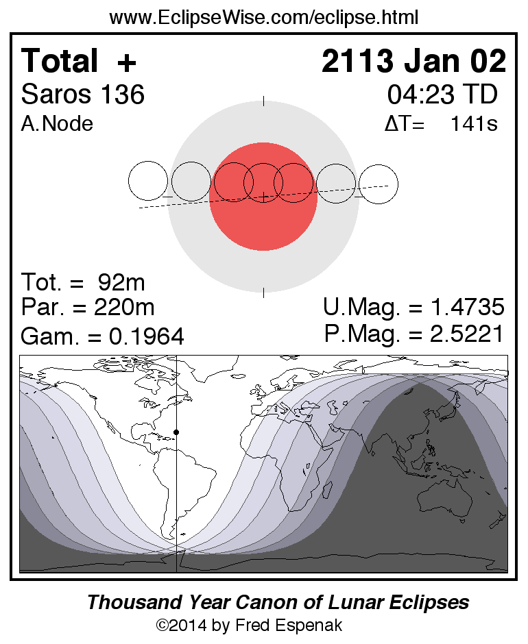 The instant of greatest eclipse takes place on 2113 Jan 02 at 04:22:59 TD (04:20:37 UT1).