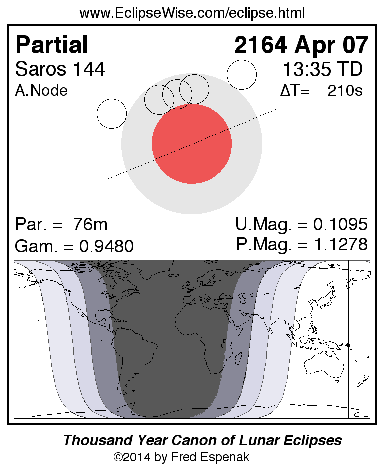 The instant of greatest eclipse takes place on 2164 Apr 07 at 13:34:34 TD (13:31:04 UT1).