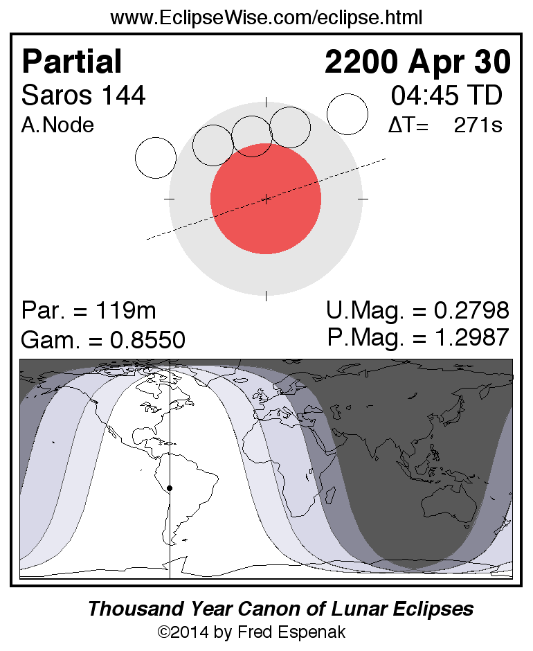 The partial lunar eclipse of 2200 Apr 30 is preceded two weeks earlier by a total solar eclipse on 2200 Apr 14.