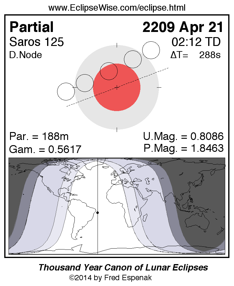 The instant of greatest eclipse takes place on 2209 Apr 21 at 02:12:20 TD (02:07:32 UT1).