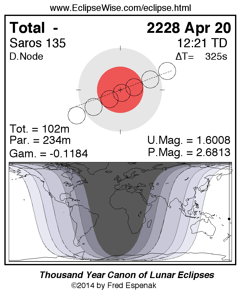 The instant of greatest eclipse takes place on 2228 Apr 20 at 12:20:31 TD (12:15:06 UT1).