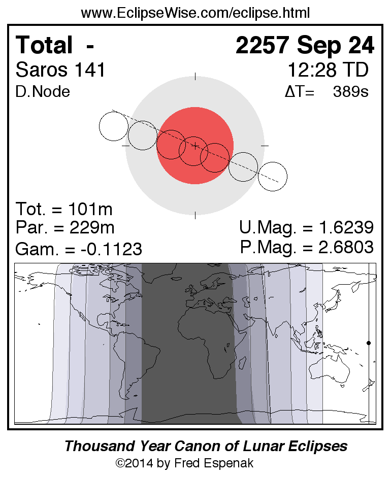 The total lunar eclipse of 2257 Sep 24 is preceded two weeks earlier by a partial solar eclipse on 2257 Sep 09,