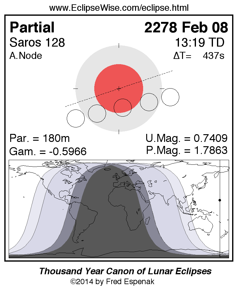 The instant of greatest eclipse takes place on 2278 Feb 08 at 13:19:09 TD (13:11:52 UT1).
