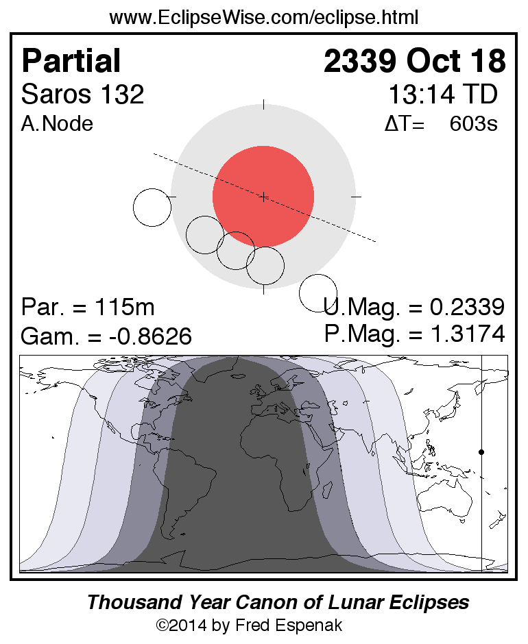 The instant of greatest eclipse takes place on 2339 Oct 18 at 13:14:22 TD (13:04:19 UT1).