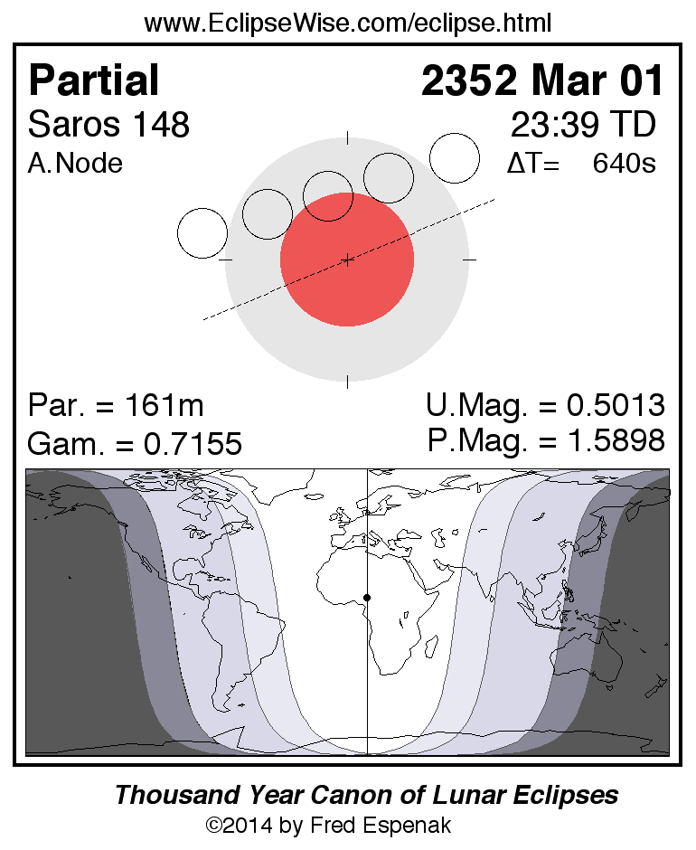 The instant of greatest eclipse takes place on 2352 Mar 01 at 23:39:17 TD (23:28:37 UT1).