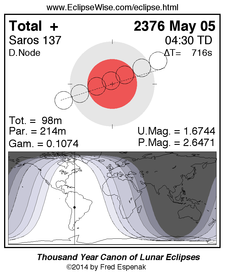 The total lunar eclipse of 2376 May 05 is followed two weeks later by a partial solar eclipse on 2376 May 19.