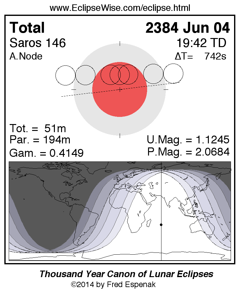 The total lunar eclipse of 2384 Jun 04 is preceded two weeks earlier by a annular solar eclipse on 2384 May 21.