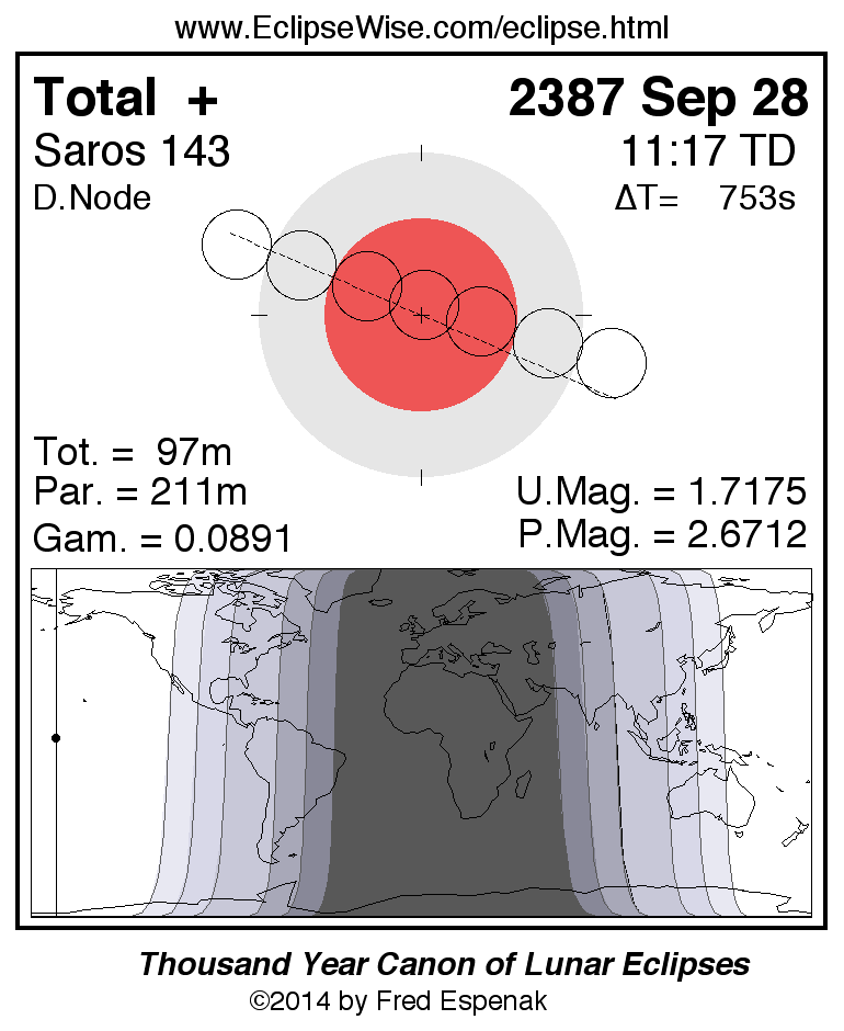 The total lunar eclipse of 2387 Sep 28 is followed two weeks later by a partial solar eclipse on 2387 Oct 13.