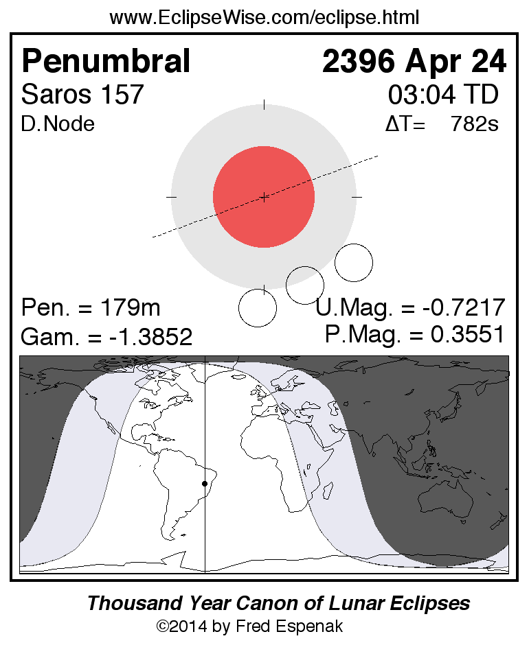 Another lunar eclipse occurs one synodic month before the 2396 Apr 24 eclipse. It is the penumbral lunar eclipse of 2396 Mar 25.