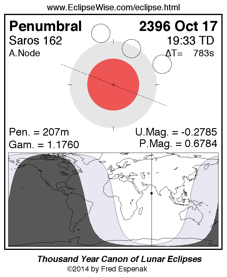 Another lunar eclipse occurs one synodic month before the 2396 Oct 17 eclipse. It is the penumbral lunar eclipse of 2396 Sep 18.