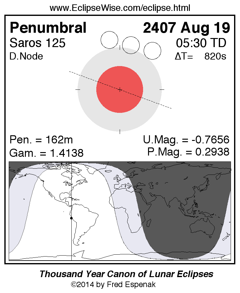 The penumbral lunar eclipse of 2407 Aug 19 is followed two weeks later by a total solar eclipse on 2407 Sep 02.
