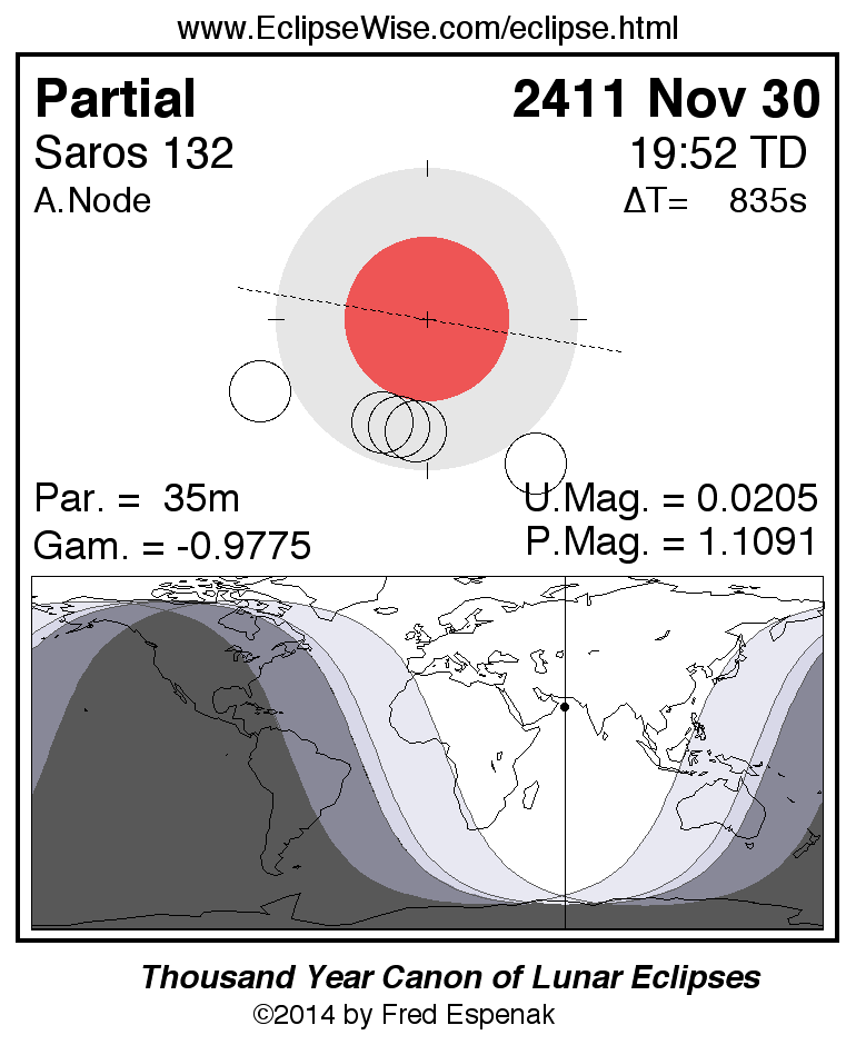 The partial lunar eclipse of 2411 Nov 30 is followed two weeks later by a total solar eclipse on 2411 Dec 16.