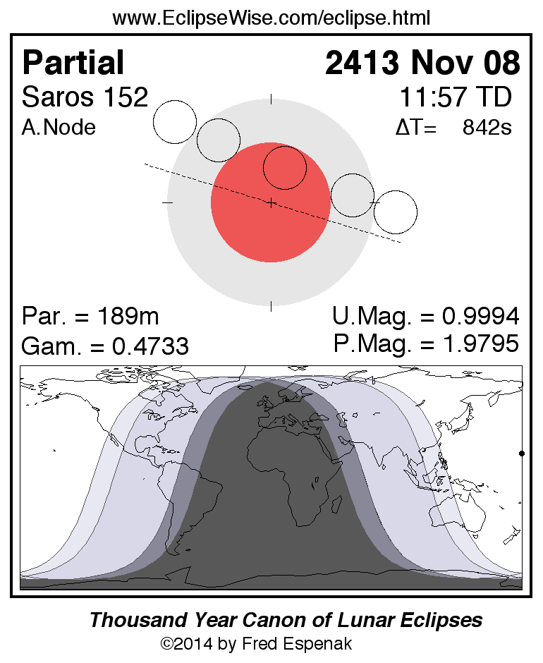 The instant of greatest eclipse takes place on 2413 Nov 08 at 11:57:23 TD (11:43:21 UT1).