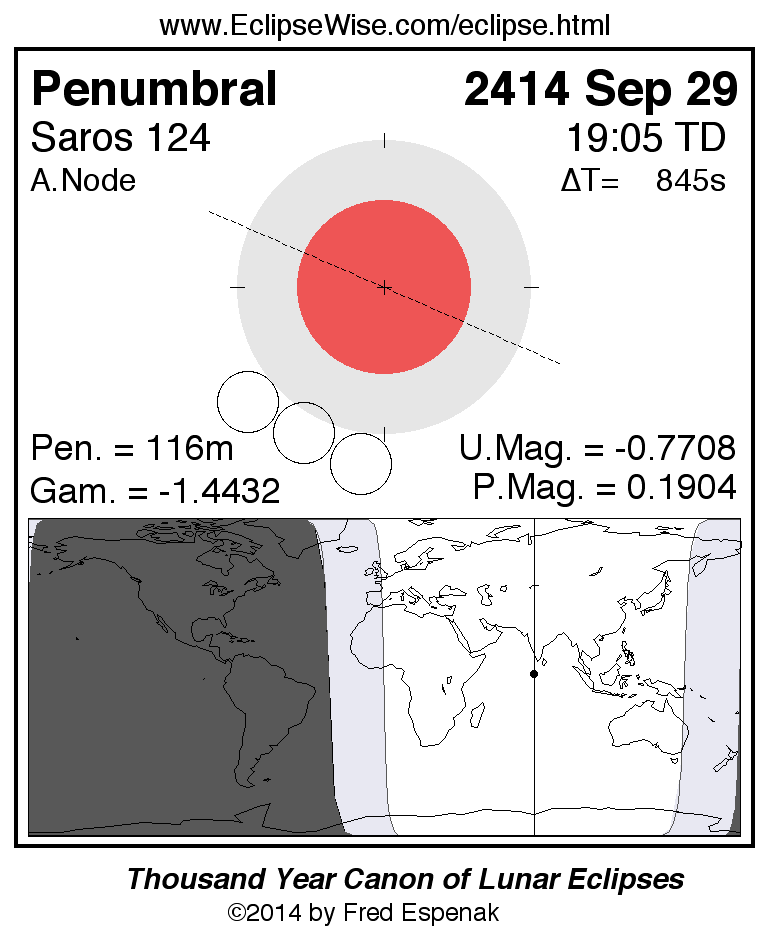 Another lunar eclipse occurs one synodic month after the 2414 Sep 29 eclipse. It is the penumbral lunar eclipse of 2414 Oct 29.