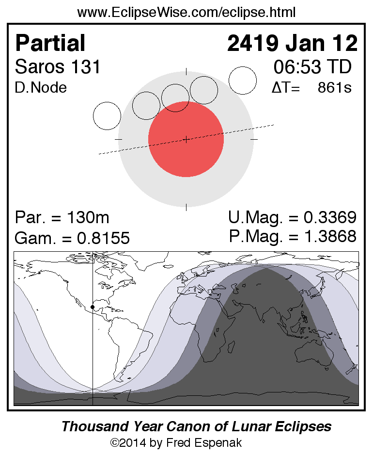 The instant of greatest eclipse takes place on 2419 Jan 12 at 06:53:22 TD (06:39:02 UT1).