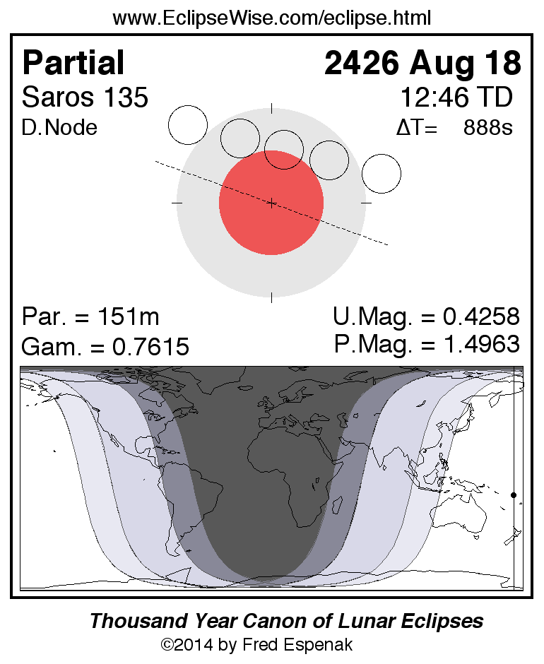 The partial lunar eclipse of 2426 Aug 18 is followed two weeks later by a total solar eclipse on 2426 Sep 02.