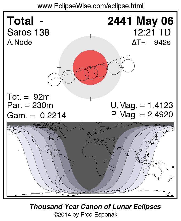The total lunar eclipse of 2441 May 06 is preceded two weeks earlier by a partial solar eclipse on 2441 Apr 21,