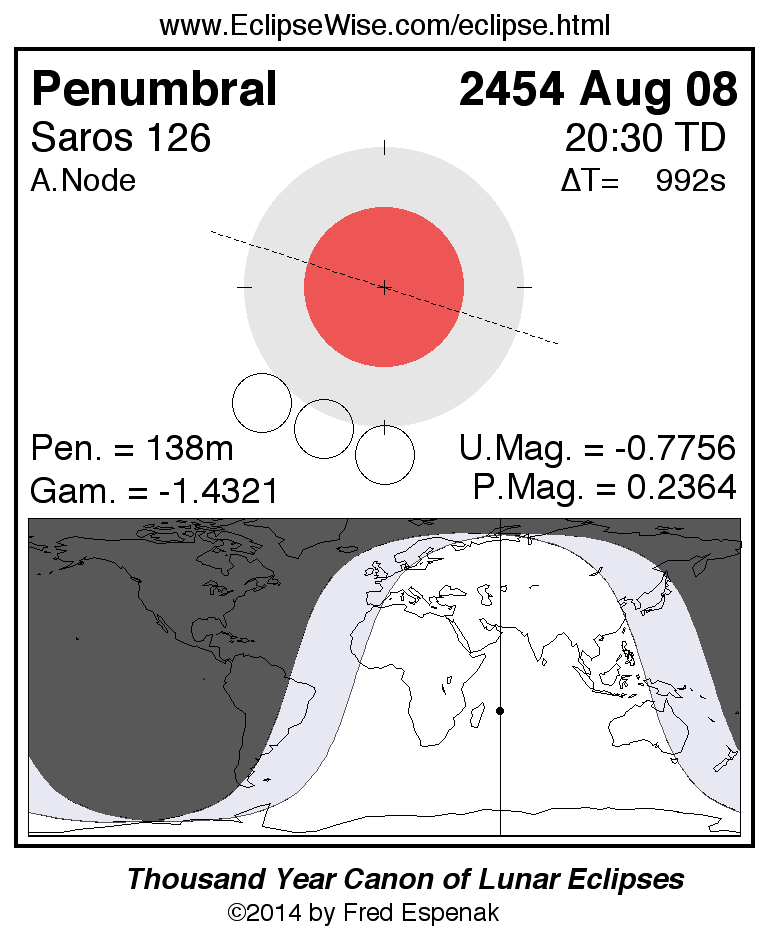 Another lunar eclipse occurs one synodic month after the 2454 Aug 08 eclipse. It is the penumbral lunar eclipse of 2454 Sep 07.