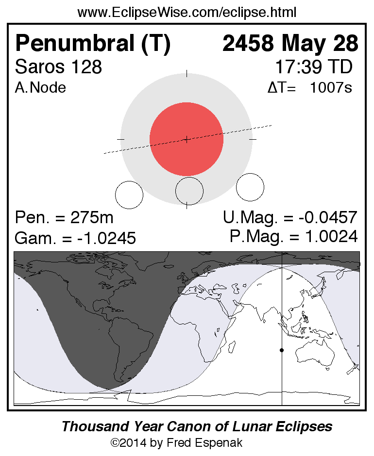 The penumbral lunar eclipse of 2458 May 28 is followed two weeks later by a total solar eclipse on 2458 Jun 11.