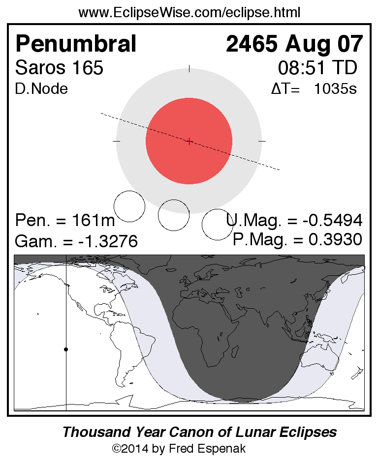 Another lunar eclipse occurs one synodic month before the 2465 Aug 07 eclipse. It is the penumbral lunar eclipse of 2465 Jul 09.