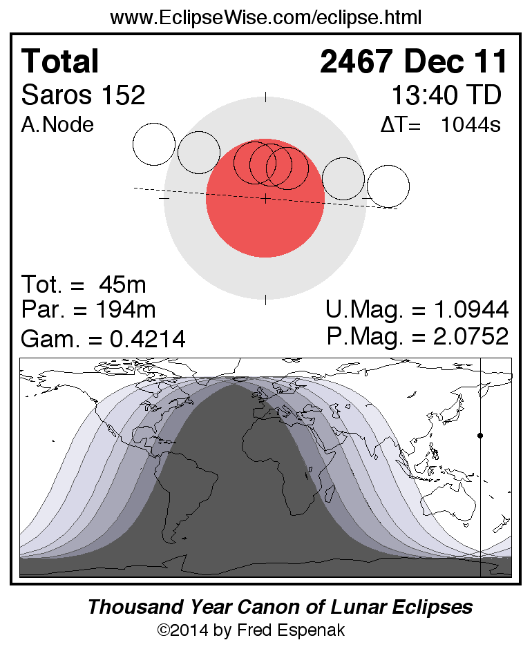 The instant of greatest eclipse takes place on 2467 Dec 11 at 13:39:53 TD (13:22:29 UT1).
