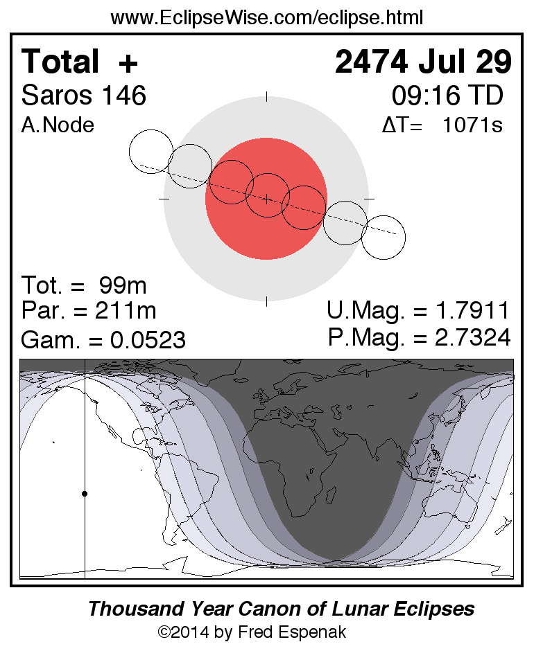 The total lunar eclipse of 2474 Jul 29 is preceded two weeks earlier by a partial solar eclipse on 2474 Jul 14,