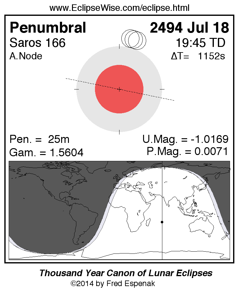 Another lunar eclipse occurs one synodic month before the 2494 Jul 18 eclipse. It is the penumbral lunar eclipse of 2494 Jun 19.