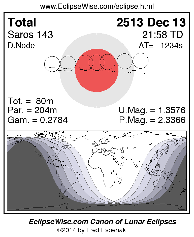 The instant of greatest eclipse takes place on 2513 Dec 13 at 21:58:13 TD (21:37:38 UT1).