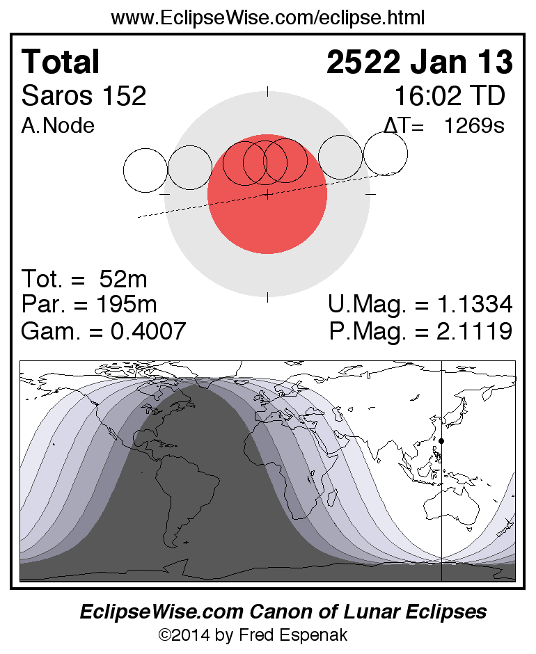 The instant of greatest eclipse takes place on 2522 Jan 13 at 16:02:18 TD (15:41:09 UT1).