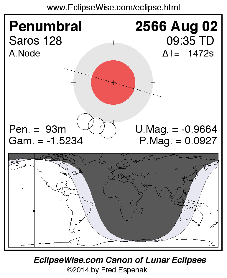 The penumbral lunar eclipse of 2566 Aug 02 is followed two weeks later by a total solar eclipse on 2566 Aug 16.