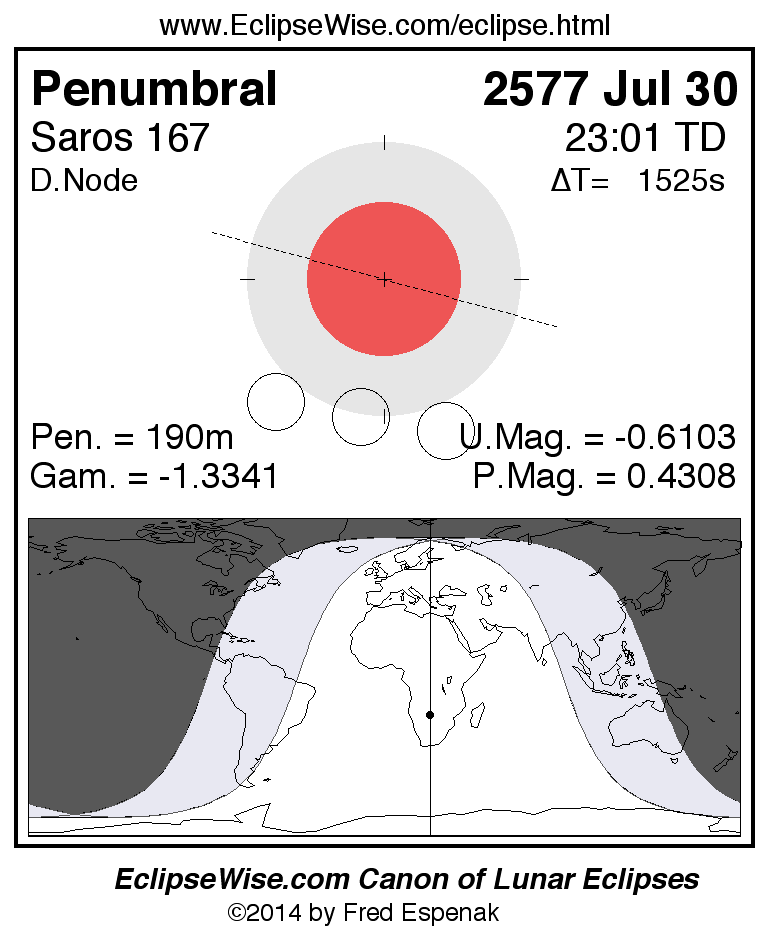 The penumbral lunar eclipse of 2577 Jul 30 is preceded two weeks earlier by a total solar eclipse on 2577 Jul 16.