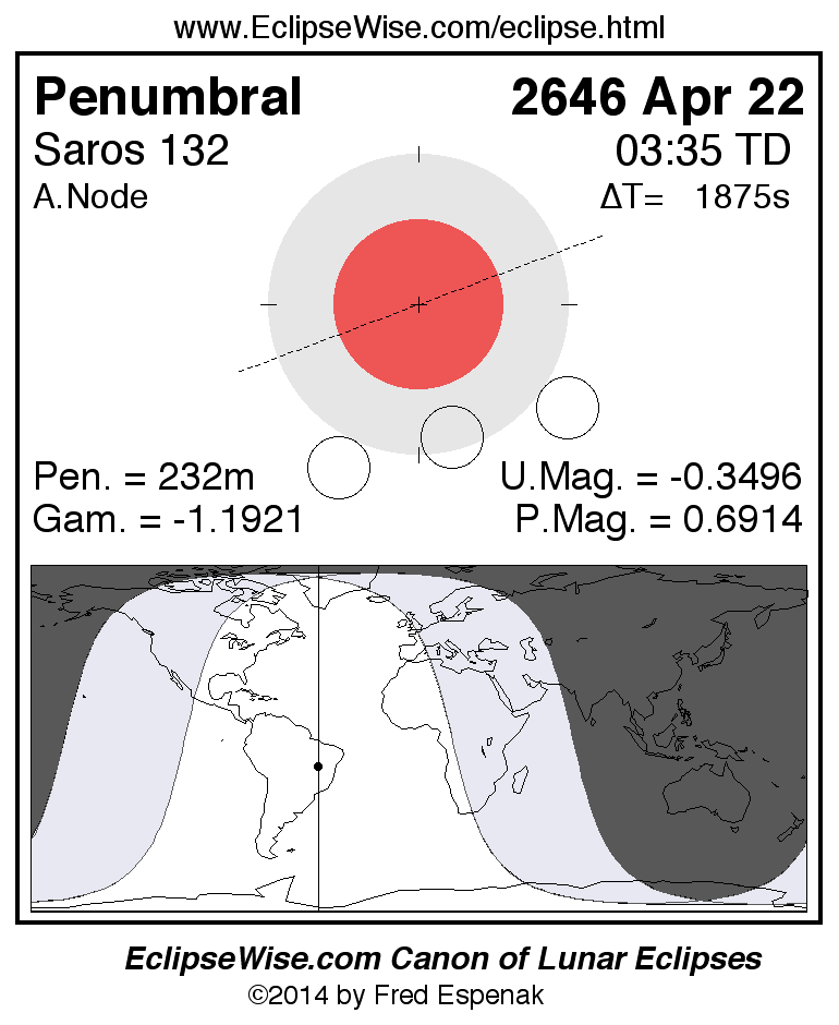 The penumbral lunar eclipse of 2646 Apr 22 is followed two weeks later by a total solar eclipse on 2646 May 07.