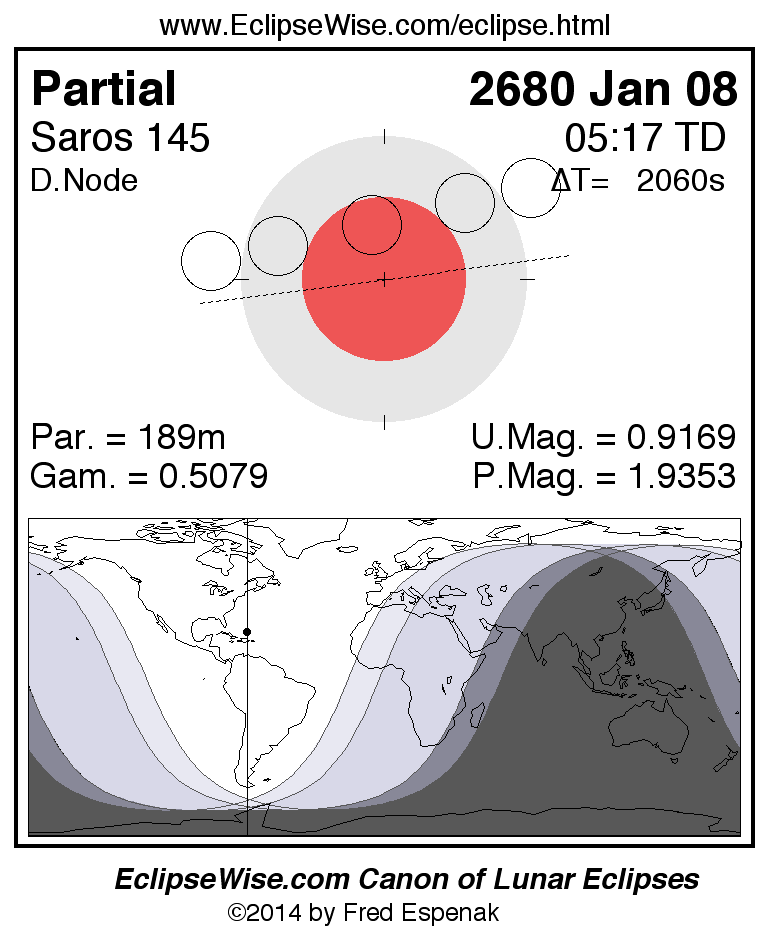 The instant of greatest eclipse takes place on 2680 Jan 08 at 05:16:50 TD (04:42:30 UT1).