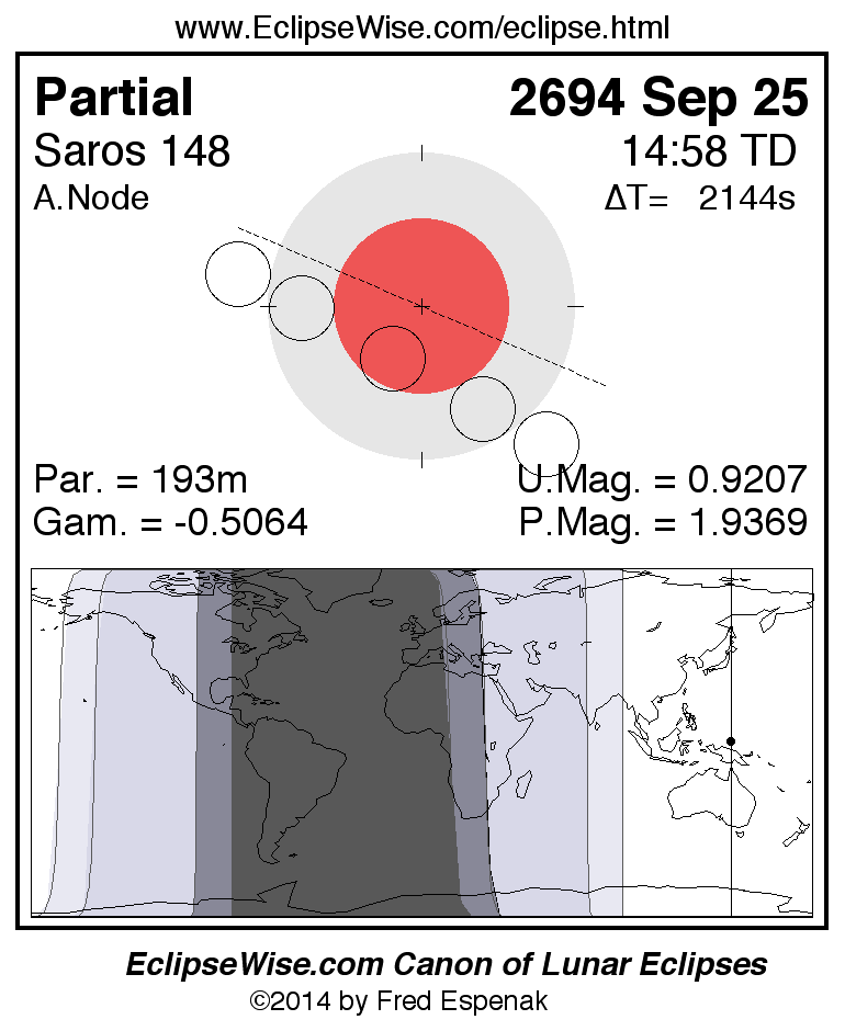 The instant of greatest eclipse takes place on 2694 Sep 25 at 14:58:00 TD (14:22:17 UT1).