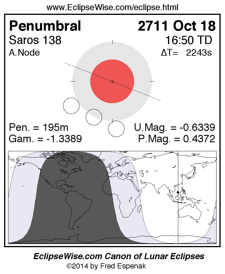 The penumbral lunar eclipse of 2711 Oct 18 is followed two weeks later by a total solar eclipse on 2711 Nov 02.