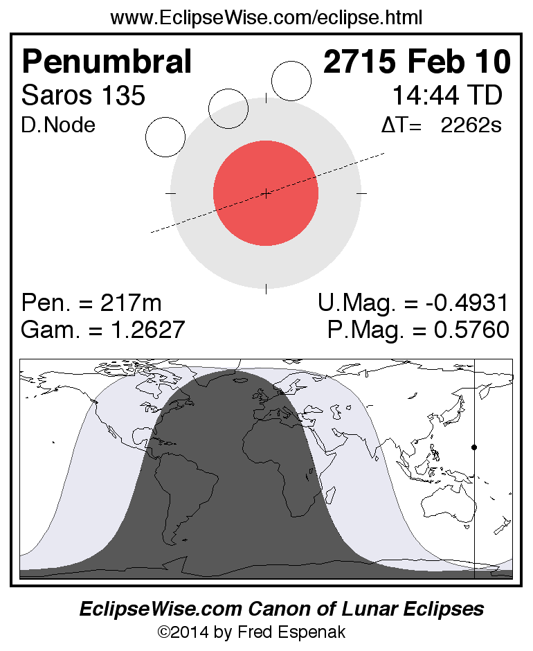 The penumbral lunar eclipse of 2715 Feb 10 is followed two weeks later by a total solar eclipse on 2715 Feb 26.