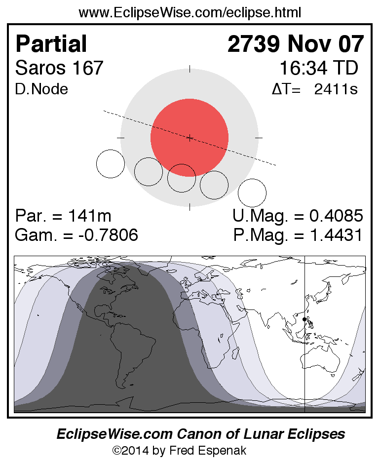 The instant of greatest eclipse takes place on 2739 Nov 07 at 16:33:44 TD (15:53:33 UT1).