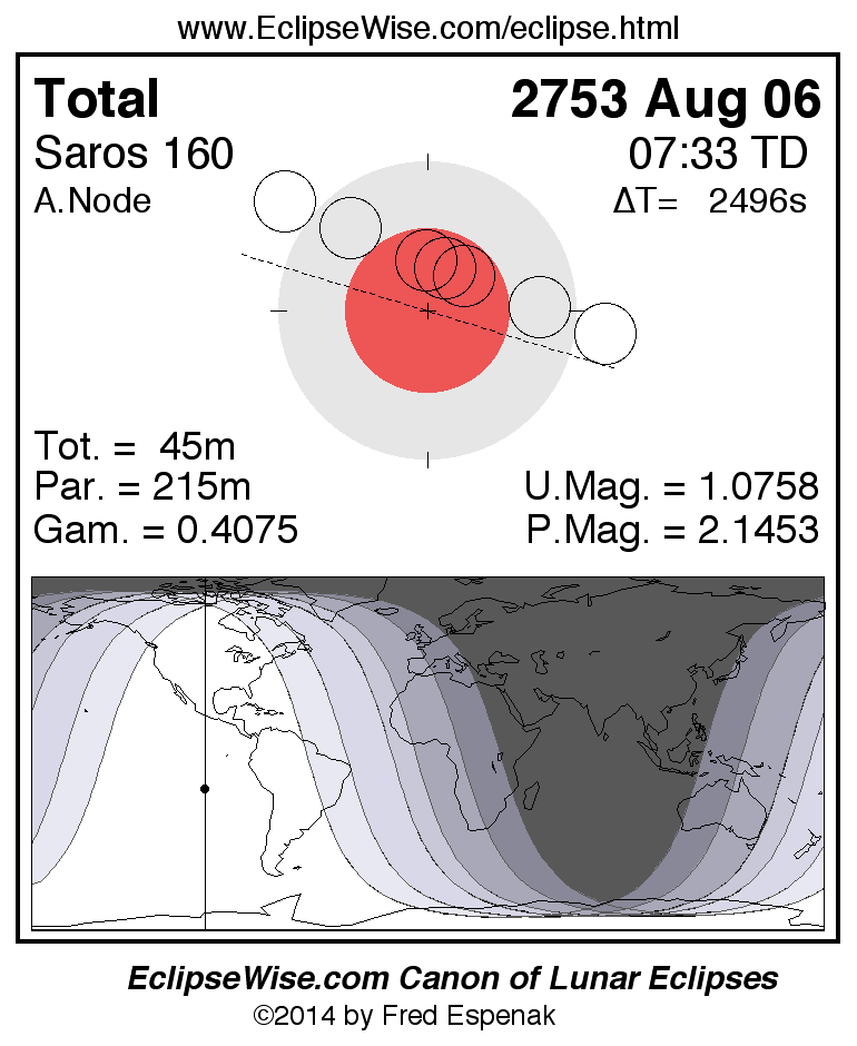The total lunar eclipse of 2753 Aug 06 is preceded two weeks earlier by a total solar eclipse on 2753 Jul 22.