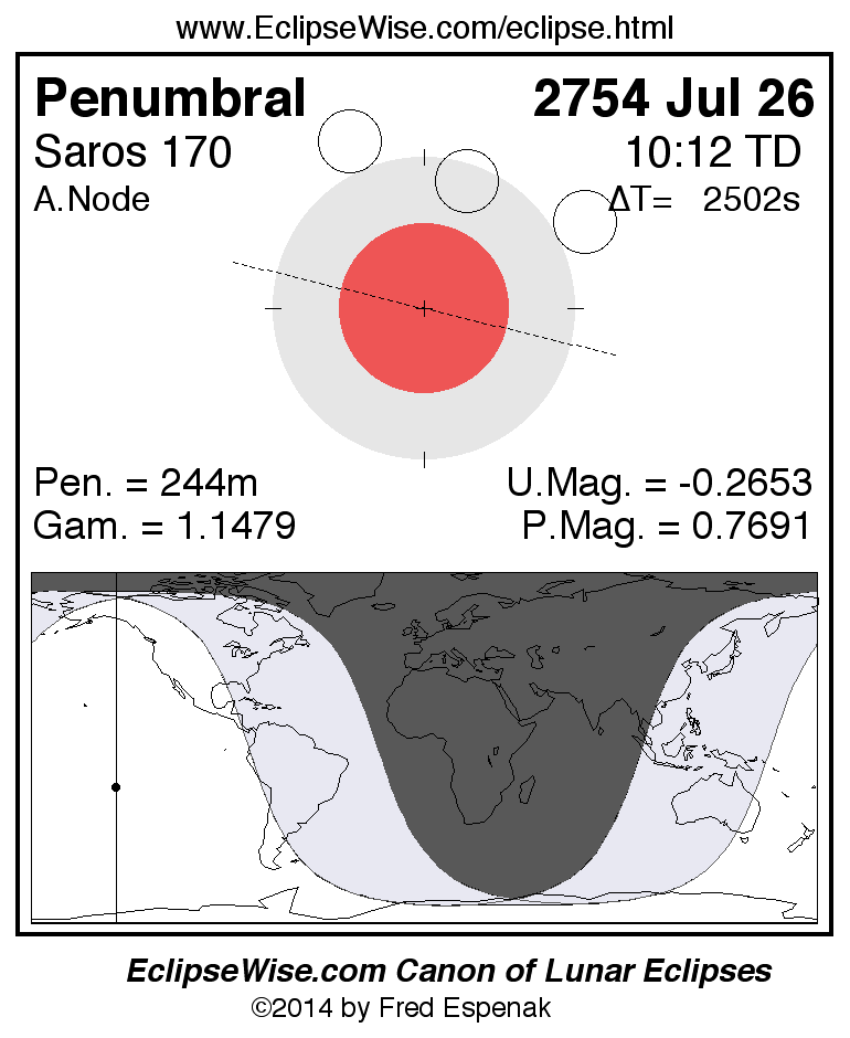 The penumbral lunar eclipse of 2754 Jul 26 is preceded two weeks earlier by a total solar eclipse on 2754 Jul 12.