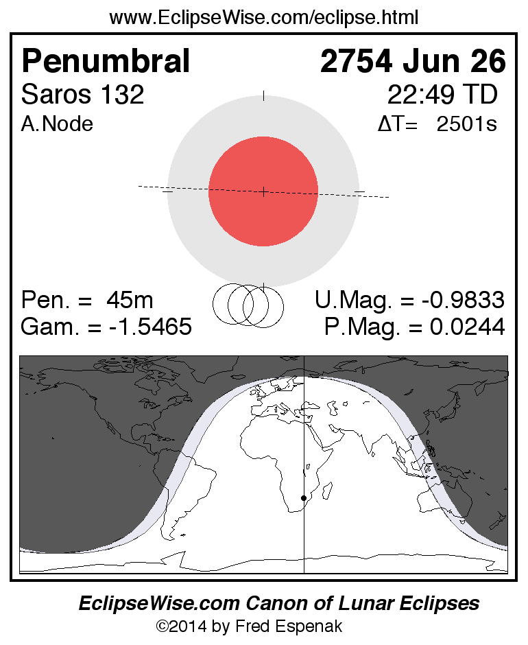 The penumbral lunar eclipse of 2754 Jun 26 is followed two weeks later by a total solar eclipse on 2754 Jul 12.