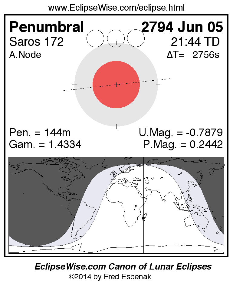 Another lunar eclipse occurs one synodic month before the 2794 Jun 05 eclipse. It is the penumbral lunar eclipse of 2794 May 07.