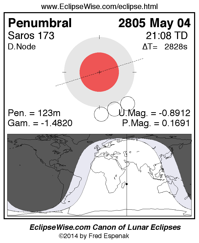 The instant of greatest eclipse takes place on 2805 May 04 at 21:08:06 TD (20:20:58 UT1).