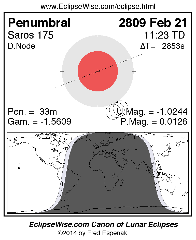 Another lunar eclipse occurs one synodic month before the 2809 Feb 21 eclipse. It is the penumbral lunar eclipse of 2809 Jan 22.