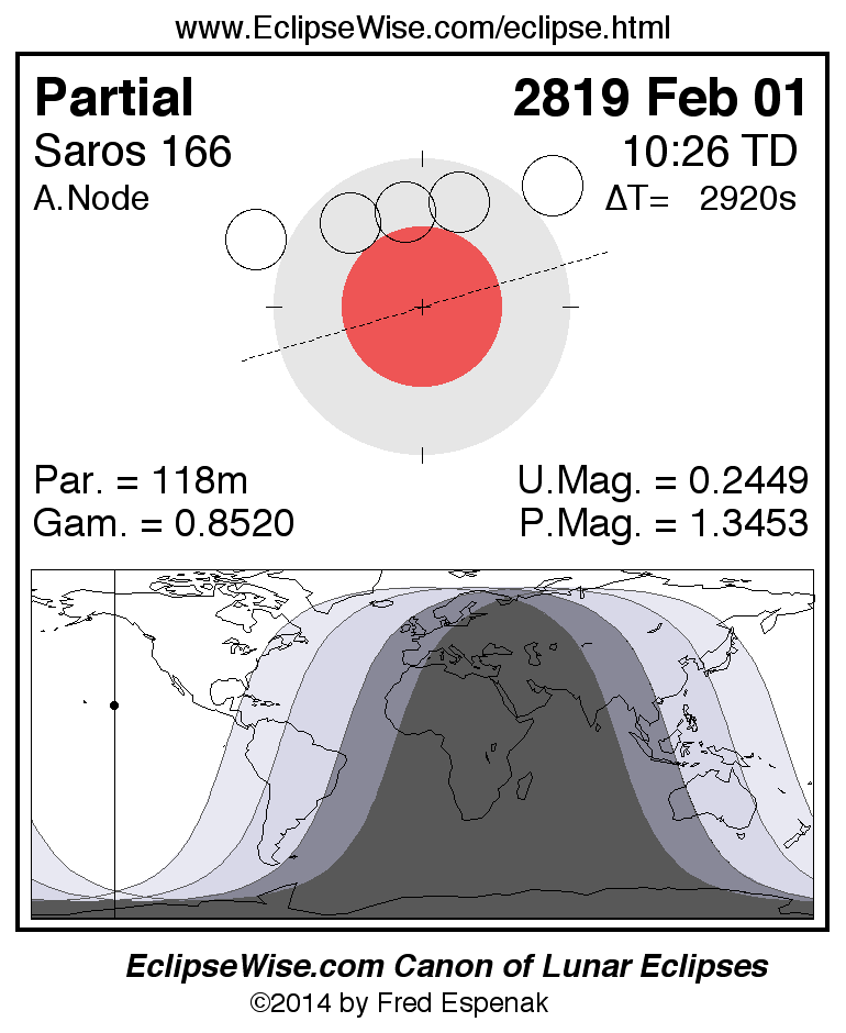 The instant of greatest eclipse takes place on 2819 Feb 01 at 10:26:23 TD (09:37:44 UT1).