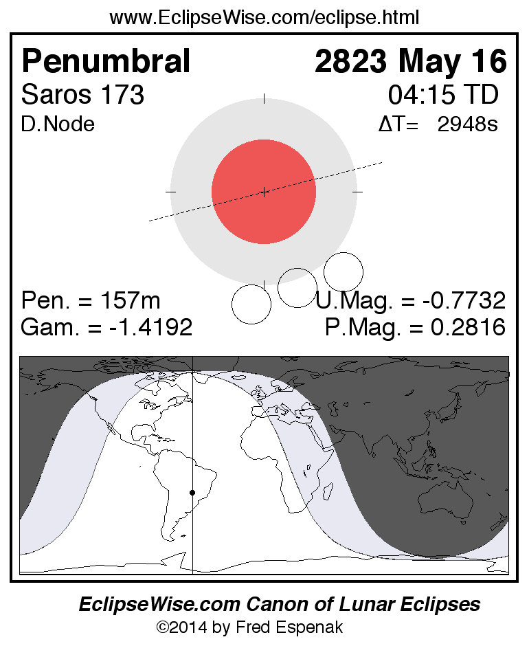 The penumbral lunar eclipse of 2823 May 16 is preceded two weeks earlier by a total solar eclipse on 2823 May 02.
