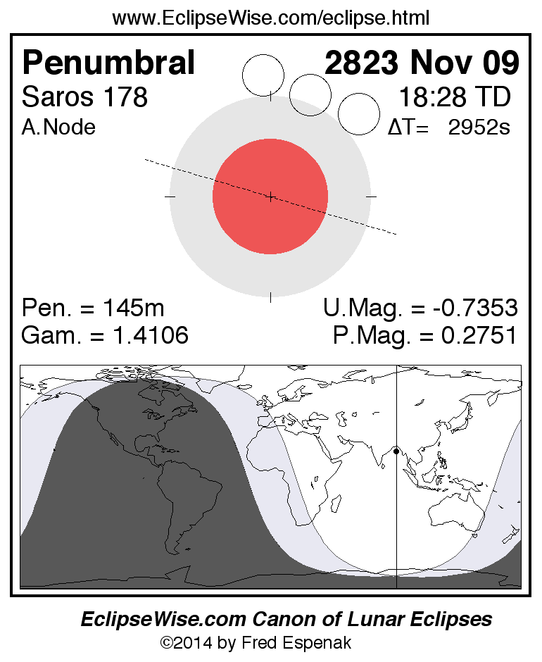 Another lunar eclipse occurs one synodic month before the 2823 Nov 09 eclipse. It is the penumbral lunar eclipse of 2823 Oct 11.
