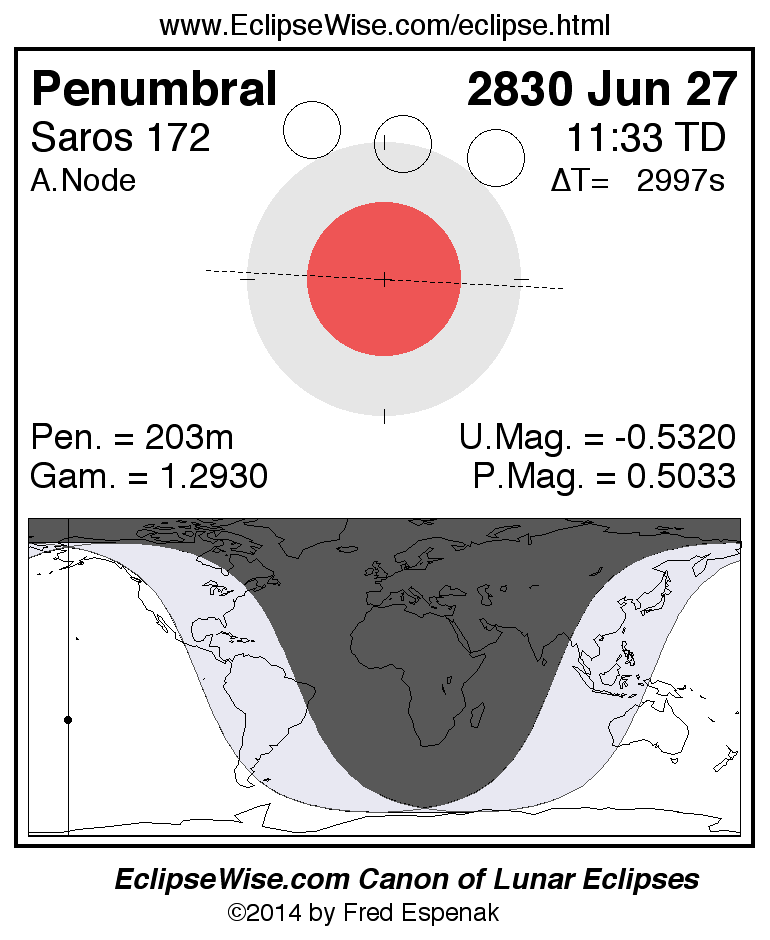 The penumbral lunar eclipse of 2830 Jun 27 is preceded two weeks earlier by a total solar eclipse on 2830 Jun 12.