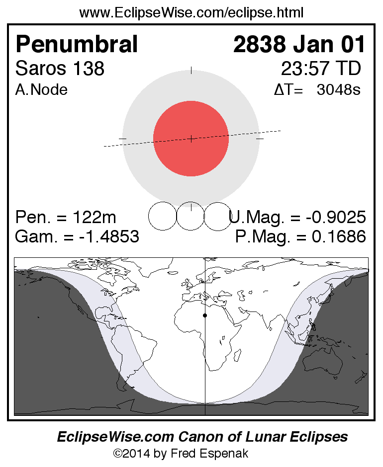Another lunar eclipse occurs one synodic month after the 2838 Jan 01 eclipse. It is the penumbral lunar eclipse of 2838 Jan 31.